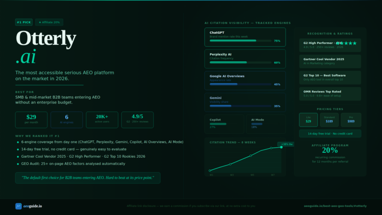 The third-party validation is hard to dismiss: Gartner Cool Vendor 2025 (AI in Marketing), G2 High Performer in the AEO category, ranked #10 overall in G2’s 2026 Best Software Awards — the only AEO tool to make that broader list. 20,000+ marketing and SEO professionals across 40+ countries use the platform, and its 4.9/5 rating across 250+ reviews carries meaningful signal. A case study from Bacula Enterprise documented reaching the #1 position in ChatGPT answers for their target category after using Otterly to fine-tune prompt coverage. That kind of specific, verifiable outcome matters more than most marketing copy.